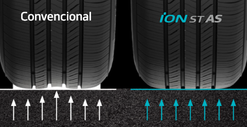 El peso de la batería hace que los vehículos eléctricos sean hasta un 30% más pesados que los de combustión interna, lo que suele provocar un desgaste irregular de las llantas. La iON ST AS está fabricada con Compuesto ProDurable específicamente diseñado para vehículos eléctricos con el fin de prolongar la vida útil de la llanta. La iON evo distribuye uniformemente la presión de la carretera gracias a la tecnología Round Even.